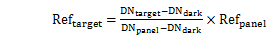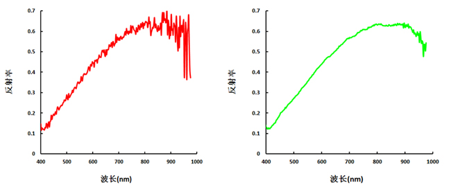 其中,Reftarget為目標(biāo)物的反射率,Refpanel為標(biāo)準(zhǔn)參考板的反射率,DNtarget為原始影像中目標(biāo)物的的數(shù)值,DNpanel為原始影像中標(biāo)準(zhǔn)參考板的數(shù)值,DNdark為成像光譜儀系統(tǒng)誤差。