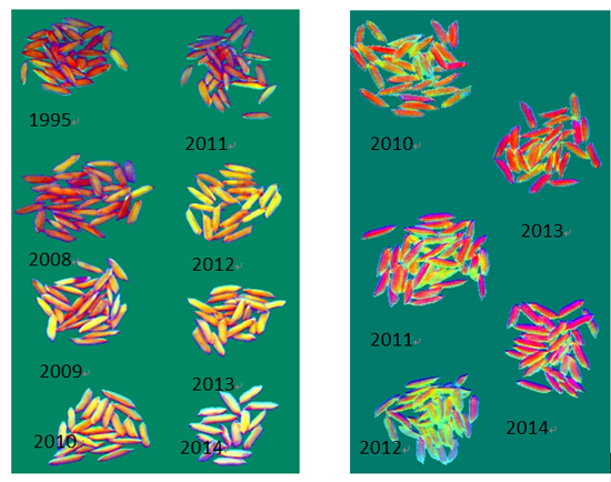 圖3為不同年份的小麥種子的高光譜圖像RGB合成圖。左圖為1995、2008、2009、2010、2011、2012、2013、2014共8年的小麥種子,右圖為2010、2011、2012、2013、2014共5年的小麥種子.