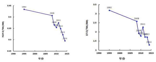 圖 9 NDVI、EVI與其相對應(yīng)年份的散點圖