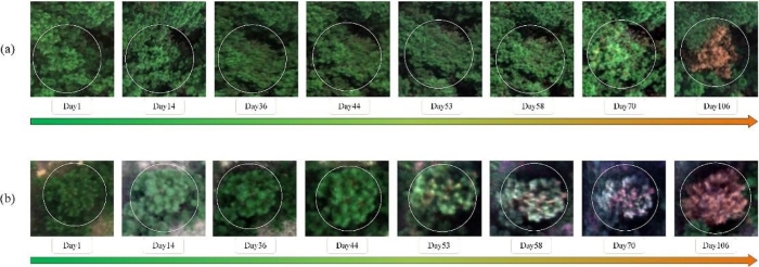 在站點(diǎn)C進(jìn)行的無(wú)人機(jī)飛行實(shí)驗(yàn)中,在接種黑松和馬尾松的樹木中,除了一棵保持健康的樹木外,其余三棵樹作為站點(diǎn)A和B表現(xiàn)出快速感染(QI)的癥狀。由于樹木中大部分癥狀變化始于樹冠中下部,因此從無(wú)人機(jī)圖像觀察時(shí),樹冠頂部針葉的變色滯后。因此,在圖像上選擇樣本像素時(shí),尤其是在可見癥狀變化期間,選擇將基于空中變色特征和地面觀測(cè),以最大限度地減少冠層頂部新鮮樹葉的干擾。