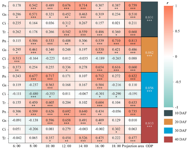 圖5 不同灌漿階段(10、20、30、40?DAF)HGW 與光合指標的 Pearson 相關系數(shù)矩陣。