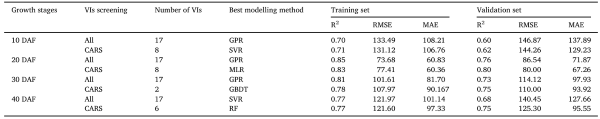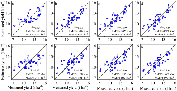 圖13 基于植被指數(shù)的產(chǎn)量估測對比。(a–d) 采用表?4中篩選的VIs;(e–h) 基于VIs與產(chǎn)量相關性篩選后的估測結果。(a) 僅10?DAF篩選VIs;(b) 10DAF?+?20DAF 篩選VIs;(c) 10、20、30?DAF篩選VIs;(d) 10、20、30、40?DAF篩選VIs;(e) 僅10?DAF相關性篩選;(f) 10?DAF?+?20?DAF相關性篩選;(g) 10、20、30?DAF 相關性篩選;(h) 10、20、30、40?DAF相關性篩選。