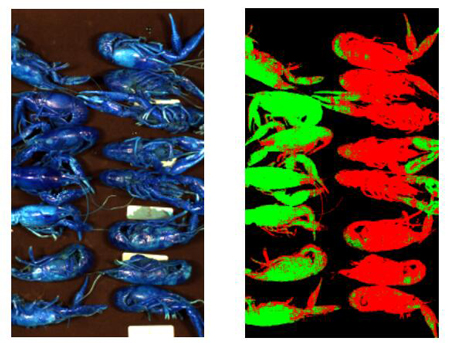 利用可見近紅外以及短波紅外高光譜成像技術(shù)對(duì)成熟的小龍蝦進(jìn)行品質(zhì)分析,研究不同品質(zhì)小龍蝦的光譜差異并通過高光譜成像技術(shù)快速識(shí)別不同品質(zhì)的小龍蝦,為餐飲行業(yè)行業(yè)快速識(shí)別不同品質(zhì)小龍蝦提供技術(shù)支持。圖2為需要利用高光譜成像設(shè)備采集分析的小龍蝦樣本,左邊為品質(zhì)好的小龍蝦,右邊為品質(zhì)壞的小龍蝦。