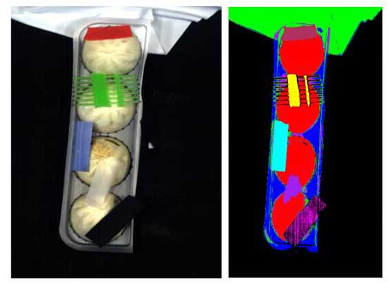 本次實驗對包子的混雜金屬、混雜玻璃片、混雜塑料片、包子完整情況(是否有餡露出來)、有無包裝紙、有何種顏色的包裝紙進行了初步的檢測,目的是為了分辨出包子中混雜的金屬、玻璃片、塑料片,以及是否露餡、是否包含包裝紙和用何種包裝紙對其進行包裝。