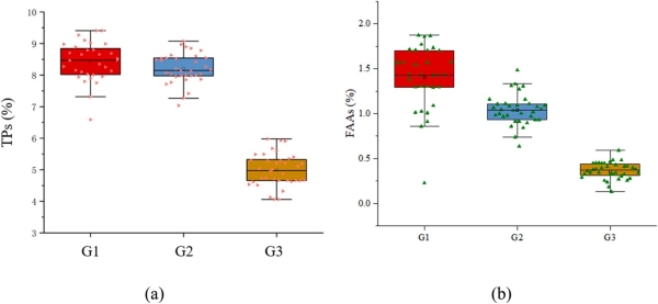 圖2.(a)不同等級(jí)的TPs值(%);(b)不同等級(jí)的FAAs值(%)。圖中G1、G2、G3分別代表茶葉的三個(gè)等級(jí)