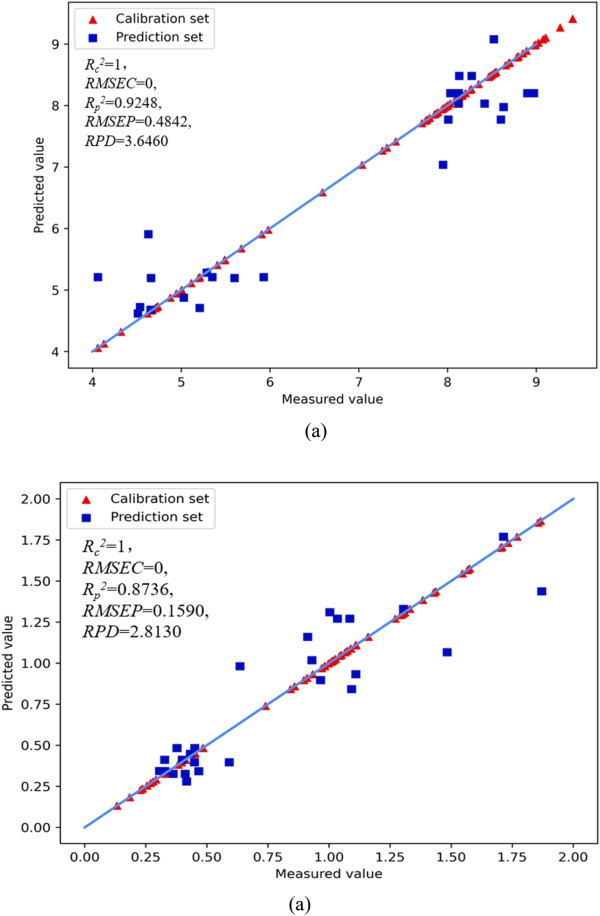 圖5. 用于茶葉樣品的預(yù)測(cè)的模型散點(diǎn)圖(a)為T(mén)Ps的預(yù)測(cè)結(jié)果;(b)為FAAs預(yù)測(cè)結(jié)果