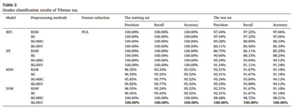 關(guān)于分類(lèi)模型。RFC和SVM下的測(cè)試結(jié)果優(yōu)于DT和KNN。為了確定最優(yōu)參數(shù),采用遺傳算法確定SVM中的參數(shù)值。結(jié)果表明,SVM的最佳參數(shù),選擇核函數(shù)的RBF,gamma= 0.6952, degree = 1,C= 1.2341。在此基礎(chǔ)上,得到了基于最優(yōu)參數(shù)的分類(lèi)結(jié)果。SG-SNV-PCA-SVM模型效果最好,訓(xùn)練集和測(cè)試集的準(zhǔn)確率、查全率和精密度均為100%,能夠準(zhǔn)確預(yù)測(cè)藏茶的品級(jí)。
