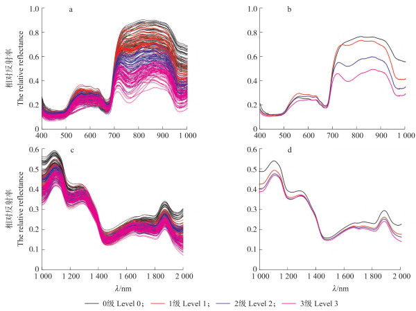 如圖13所示:在400~1000 nm、1000~2000 nm波長下,不同冷害程度獼猴桃的平均光譜的總體趨勢是相似的,正常樣品的相對反射率高于冷害樣品,冷害等級越高,相對反射率越低,這可能是由于冷害過程中獼猴桃果實中的成分發(fā)生了變化,樣本的組織塌陷、色素受損造成光反射減少,從而導致相對反射率隨冷害程度加劇而降低。