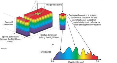 高光譜成像技術(shù)的定義是在多光譜成像的基礎(chǔ)上,在從紫外到近紅外(200-2500nm)的光譜范圍內(nèi),利用成像光譜儀,在光譜覆蓋范圍內(nèi)的數(shù)十或數(shù)百條光譜波段對(duì)目標(biāo)物體連續(xù)成像。在獲得物體空間特征成像的同時(shí),也獲得了被測(cè)物體的光譜信息。