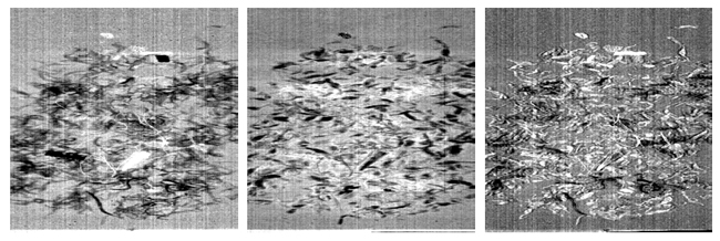 圖7為決策樹(shù)的分叉圖,主要運(yùn)用了MNF變化的MNF2、3、4、5波段,以及高光譜圖像數(shù)據(jù)的第15、80、104波段做決策樹(shù)分類,該閾值是運(yùn)用最大類間方差法獲取。圖8為利用該決策樹(shù)的分類效果圖,從圖中可知,原圖無(wú)法用肉眼識(shí)別的塑料繩、雜質(zhì)等,運(yùn)用決策樹(shù)分類后能較為清晰的識(shí)別出來(lái),而且圖像處理速度大大提高。