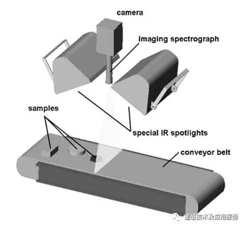 儀器使用江蘇雙利合譜科技有限公司的GaiaSorter-N25E,波長范圍為1000-2500 nm,光譜分辨率為12 nm,圖像分辨率為384*288 pixel,光譜儀幀數(shù)為400 fps。采集數(shù)據(jù)時,光源使用2個200 W的鹵鎢燈,鏡頭距樣品的高度為60cm,曝光時間為20ms,測試平臺移動速度為2cm/s。圖1 為樣本測試示意圖。