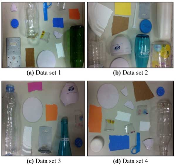 實驗中使用的材料是金屬部件,玻璃瓶子,紙板和紙張樣品,以及塑料樣品幾種類型,即PET、HDPE、PVC、LDPE、PP和PS。每一種材料其顏色和形狀均不一致,目的是檢測模型的穩(wěn)定性。