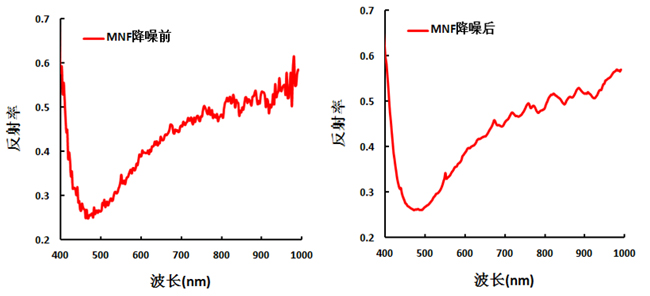 其次是噪聲去除,本文運(yùn)用國(guó)外較為常用的最小噪聲分離方法(Minimum Noise Fraction Rotation, MNF)進(jìn)行噪聲去除。最小噪聲分離工具用于判定圖像數(shù)據(jù)內(nèi)在的維數(shù)(即波段數(shù)),分離數(shù)據(jù)中的噪聲,減少隨后處理中的計(jì)算需求量。MNF本質(zhì)上是兩次層疊的主成分變換。第一次變換(基于估計(jì)的噪聲協(xié)方差矩陣)用于分離和重新調(diào)節(jié)數(shù)據(jù)中的噪聲,這步操作使變換后的噪聲數(shù)據(jù)只有最小的方差且沒(méi)有波段間的相關(guān)。第二步是對(duì)噪聲白化數(shù)據(jù)(Noise-whitened)的標(biāo)準(zhǔn)主成分變換。為了進(jìn)一步進(jìn)行波譜處理,通過(guò)檢查最終特征值和相關(guān)圖像來(lái)判定數(shù)據(jù)的內(nèi)在維數(shù)。數(shù)據(jù)空間可被分為兩部分:一部分與較大特征值和相對(duì)應(yīng)的特征圖像相關(guān),其余部分與近似相同的特征值以及噪聲占主導(dǎo)地位的圖像相關(guān)。圖7為MNF降噪前后的光譜反射率變化。