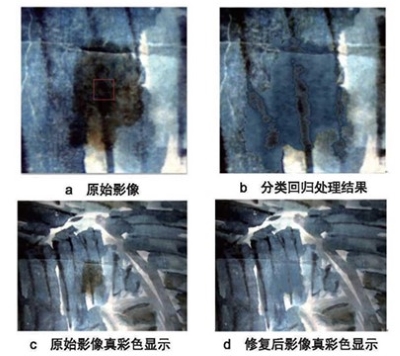 周平平等人在研究中提出了一種基于高光譜影像分類線性回歸的古畫污漬虛擬修復(fù)方法,針對(duì)清代絹本古畫上存在的油漬污染區(qū)域,通過高光譜成像技術(shù)結(jié)合支持向量機(jī)(SVM)分類和人工神經(jīng)網(wǎng)絡(luò)(ANN),對(duì)污漬區(qū)域內(nèi)隱含信息進(jìn)行提取。研究通過分析影像中油漬影響小的波段,建立分類線性回歸模型校正污染波段,恢復(fù)油漬覆蓋區(qū)的原始顏料和色彩。修復(fù)后影像(圖13)顯現(xiàn)出污漬下的顏料信息,葉脈紋絡(luò)清晰可見。實(shí)驗(yàn)證明,該方法能有效提取隱藏信息,恢復(fù)古畫原貌,提升藝術(shù)表現(xiàn)力與鑒賞價(jià)值。