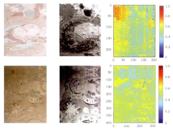 Pan等人提出了一種基于高光譜成像的空間-光譜特征結(jié)合方法,用于提取褪色壁畫中的目標(biāo)圖案。該方法結(jié)合輻射校準(zhǔn)、主成分分析去噪及歸一化比值指數(shù)(NRI)增強(qiáng)光譜特征,通過密度分割與掩模技術(shù)分離目標(biāo)區(qū)域。實(shí)驗(yàn)證明,其能高效提取壁畫中幾乎不可見的圖案(圖3),相比傳統(tǒng)方法,操作簡(jiǎn)便、客觀無(wú)損,適用于明顯光譜特征圖案提取,為壁畫數(shù)字化保護(hù)與研究提供了技術(shù)支持。