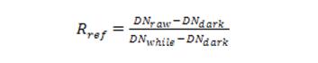 在進(jìn)行高光譜圖像采集時(shí),需要設(shè)置相機(jī)曝光時(shí)間,平臺移動速度以及物鏡之間的距離。這 3 個參數(shù)相互影響,圖像調(diào)節(jié)的目的是使采集的圖像大小合適,清晰,不變形失真。經(jīng)過反復(fù)嘗試,物鏡高度設(shè)置為 31 cm,曝光時(shí)間設(shè)置為10ms,平臺移動速度分別設(shè)置為 4.8 mm/s(400-1000 nm)、14mm/s(1000-2500 nm)。圖像采集軟件采用江蘇雙利合譜科技有限公司提供的高光譜成像系統(tǒng)采集軟件完成。圖像處理采用 ENVI5.3 軟件進(jìn)行處理。在進(jìn)行圖像處理之前,先要對采集的光譜圖像進(jìn)行圖像校正,圖像校正公式如下: