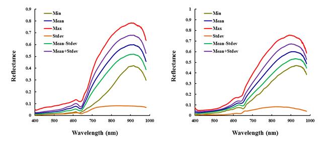 (b)2002年某市陳皮內(nèi)(左)外(右)層高光譜反射率(400 nm-1000nm)