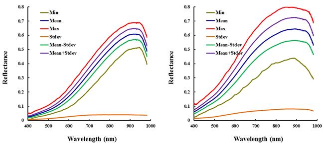 圖4和圖5為新會2013年和2014年陳皮里外層部分在1000 nm-2500nm范圍內(nèi)的光譜反射率的最大值、最小值、均值、方差、均值±方差曲線。