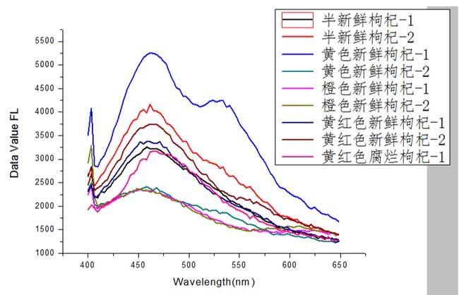 3、腐爛枸杞的熒光波峰還是在靠近455nm,但與新鮮和半新鮮的比較起來,在400-450nm之間,其腐爛類的信號明顯低于新鮮和半新鮮的。