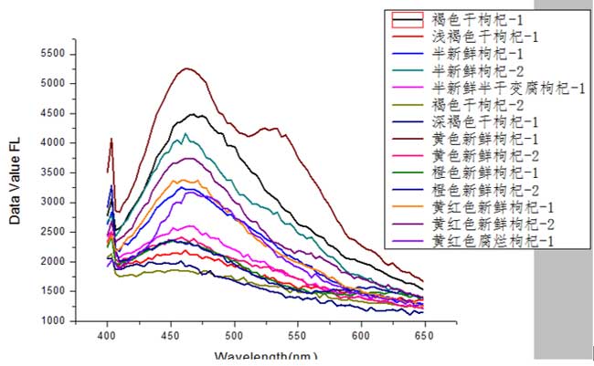 1、干枸杞熒光信號也分布在455nm附近,與新鮮枸杞比較,在550nm附近沒有波峰,而且整個光譜都隨著新鮮的程度其光譜曲線逐漸下降;