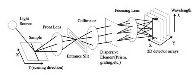 高光譜成像技術(shù)是利用成像光譜儀對(duì)目標(biāo)物體在光譜覆蓋范圍內(nèi)的數(shù)十或數(shù)百條譜線進(jìn)行連續(xù)掃描成像,在獲得目標(biāo)物體外部特征圖像信息的同時(shí),也能獲得反應(yīng)其內(nèi)部成分的光譜信息。典型推掃式高光譜成像系統(tǒng)的結(jié)構(gòu)如圖 1 所示,主要由光源、電控移動(dòng)臺(tái)、色散元件、面陣探測(cè)器等幾部分組成。