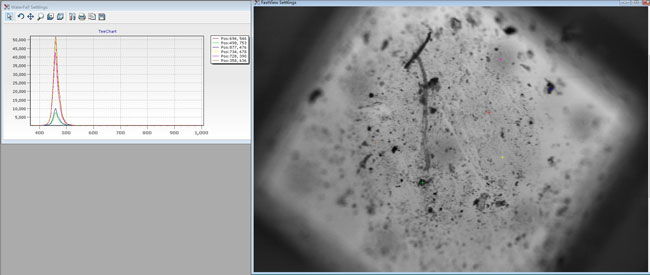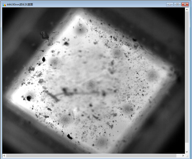 利用顯微高光譜系統(tǒng)在10X倍的物鏡下能夠觀察到LED光源上的微觀構(gòu)造,并且能夠準(zhǔn)確的測試到不同led光源對應(yīng)的特征波長,而且圖像也非常的清晰(實際測試時樣品并非完全平整),通過焦距調(diào)試,能夠凸顯出光源自身的一些特征信息。