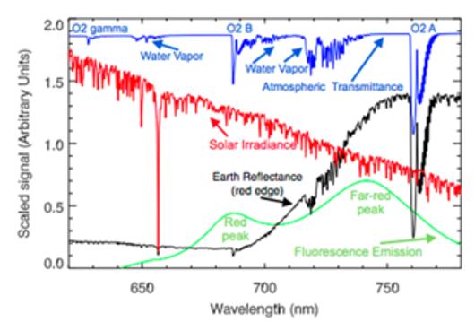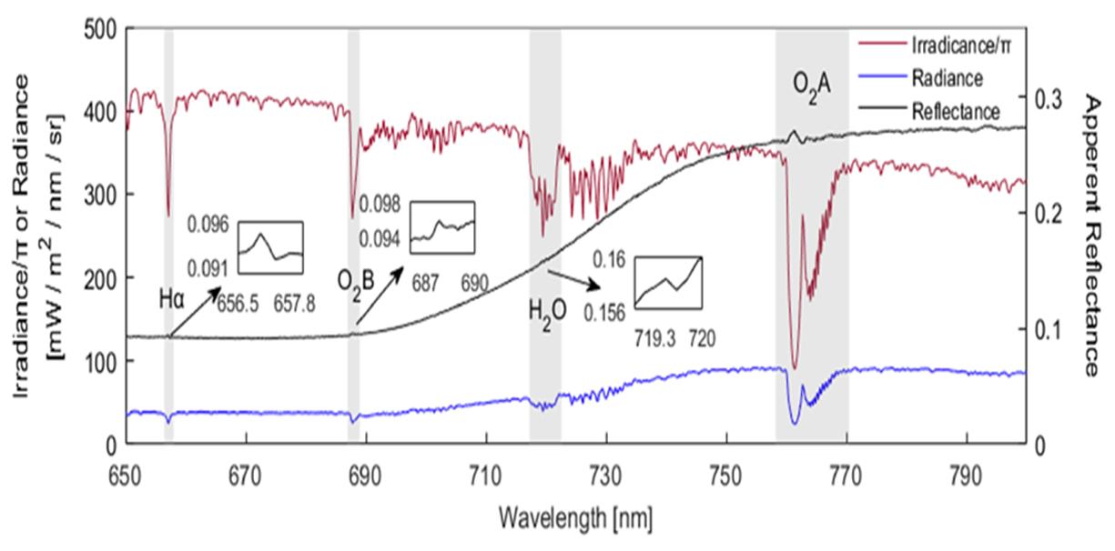葉綠素?zé)晒夥瓷涔庾V的波段常與太陽(yáng)輻射在紅光和近紅外的3個(gè)主要的吸收波段(即656.3nm處的太陽(yáng)大氣的氫吸收線,687和760nm波段處的地球大氣層氧吸收線)相互重疊。687nm和760nm附近的氧氣吸收線形成的夫瑯禾費(fèi)暗線較明顯,熒光強(qiáng)度高。大氣中的氧分子在760nm波段附近形成了