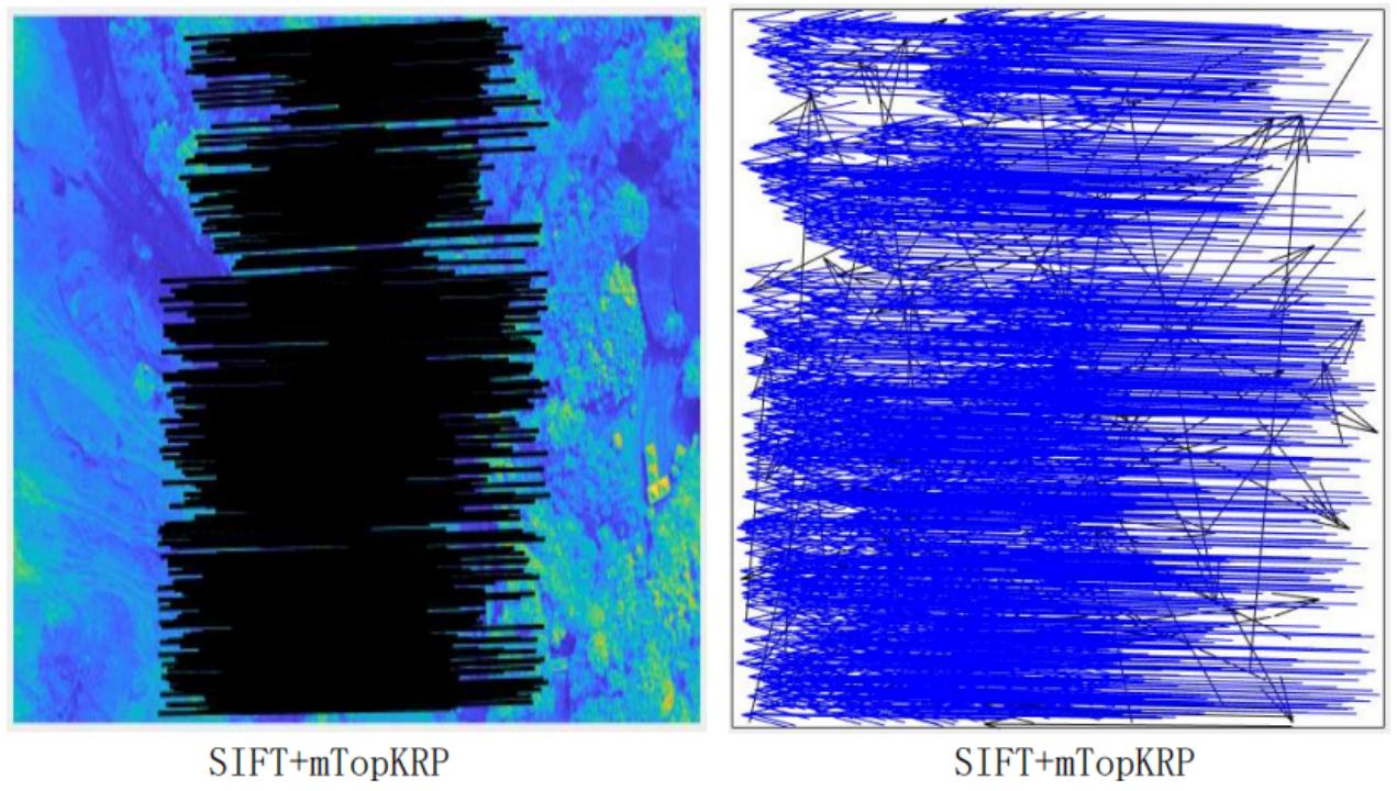 無人機拍攝的遙感圖像通常存在局部地形變化、尺度變化、旋轉、視差以及其他非剛性變化等情況,在特征點的匹配過程中會造成很多誤匹配現(xiàn)象。為了解決這個問題,本研究采用基于mTopKRP的算法來剔除誤匹配,得到的結果如圖3所示。