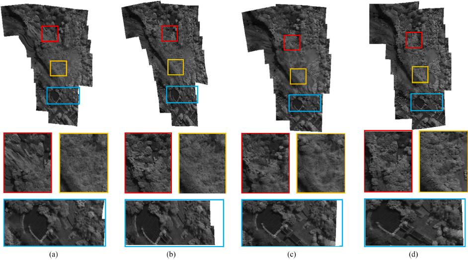 從以上實驗結果中可以看出,無論是在圖像存在剛性變換還是非剛性變換時,本研究特征點匹配算法mTopKRP都得到了更好的F-score,證實了我們的特征點匹配算法的優(yōu)越性。在得到正確的匹配點集之后,我們需要用匹配的特征點來建立圖片對之間的變換關系,即計算圖片對之間的單應性矩陣。為了避免投影變換帶來的失真,本研究采用基于魯棒彈性扭曲的算法。并將本研究采用的圖像變換模型和其他圖像變換模型ANAP,NISwGSP和ELA進行對比,實驗利用線性加權的圖像融合算法,分別在單個波段拼接了18幅高光譜圖像,得到圖5的結果。
