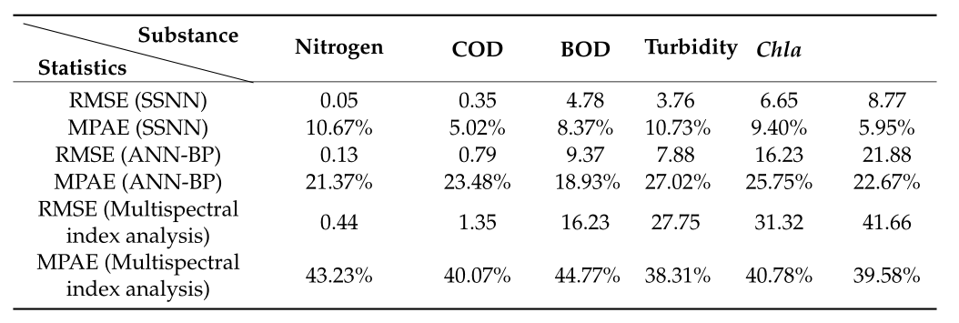 表3列出了不同方法在整個(gè)區(qū)域測試集上的性能,包括SSNN、傳統(tǒng)單層神經(jīng)網(wǎng)絡(luò)和Liew等人的經(jīng)驗(yàn)方法。本研究所提出方法在RMSE和MPAE方面優(yōu)于其他方法。SSNN對氮的估算效果最佳(MPAE最低)。MPAE比RMSE更有說服力,因?yàn)樗行У刈C明了所提出方法的數(shù)值預(yù)測的準(zhǔn)確性。后期需要在整個(gè)區(qū)域內(nèi)收集更多的數(shù)據(jù),以確保對各項(xiàng)水質(zhì)參數(shù)進(jìn)行準(zhǔn)確的數(shù)值預(yù)測。氮的R2值比其他的R2值大,而一些R2值高的水質(zhì)參數(shù)由于隨機(jī)樣本量小,其MPAE可能并不低。本研究所提出的方法對大多數(shù)水質(zhì)參數(shù)的預(yù)測是正確的,盡管樣本沒有覆蓋整個(gè)區(qū)域上所有間隔40厘米的像素點(diǎn)。