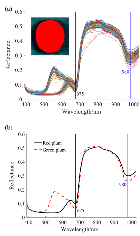 紅和綠李子在390 ~ 1030 nm范圍內(nèi)的光譜如圖2所示。結(jié)果表明,兩個(gè)品種李子的光譜變化趨勢(shì)相似,均在675 nm和980 nm處有兩個(gè)寬帶吸收區(qū)。675 nm附近的區(qū)域反映了葉綠素含量引起的果實(shí)顏色變化。980 nm的近紅外光譜吸收區(qū)域可能來自碳水化合物和水的OH基團(tuán)的結(jié)合作用。