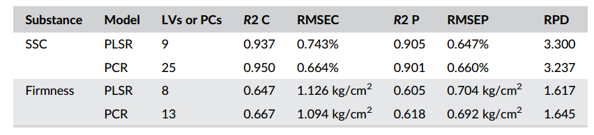表1 SSC和硬度的PLSR和PCR模型的性能