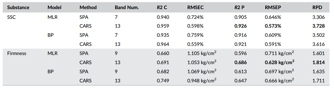 表2 基于SPA和CARS選擇的特征變量的MLR和BP模型對(duì)SSC和硬度的預(yù)測(cè)性能