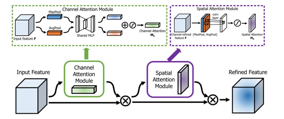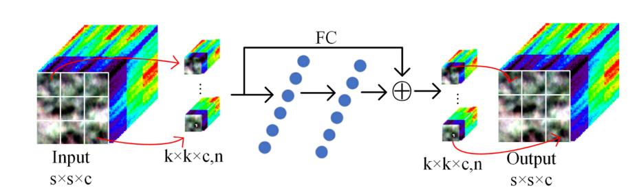本研究中使用了局部特征增強模塊(Local feature enhancement, LFE)(圖2)和全局特征增強模塊(Global feature enhancement, GFE)(圖3)。LFE使用二維卷積來學(xué)習(xí)HSI的局部特征,并使用殘差結(jié)構(gòu)來增強特征重用。GFE通過FC層學(xué)習(xí)各子patch之間的相關(guān)特征,獲得全局特征信息。CBAM模塊包括通道注意模塊和空間注意模塊,如圖4所示。