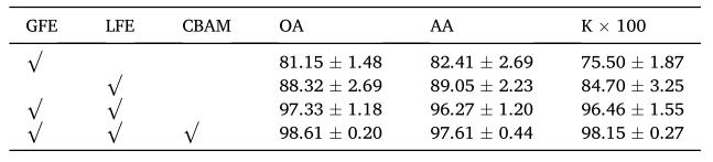 為了驗證各模塊的有效性,進行了消融試驗分析。比較了僅使用GFE模塊的網(wǎng)絡(luò)、僅使用LFE模塊的網(wǎng)絡(luò)、使用GFE + LFE模塊的網(wǎng)絡(luò)和最終的LGFEN網(wǎng)絡(luò)。如表1所示,同時提取局部和全局特征的網(wǎng)絡(luò)的分類性能優(yōu)于局部特征和全局特征分別提取。這表明GFE和LFE聯(lián)合是有效的。在此基礎(chǔ)上,加入CBAM注意力模塊的LGFEN網(wǎng)絡(luò)獲得了*佳的分類性能。與未添加CBAM模塊的GFE + LFE網(wǎng)絡(luò)相比,OA(整體精度)、AA(平均精度)和K(Kappa系數(shù))分別提高了1.28%、1.37%和1.96%。此外,LGFEN網(wǎng)絡(luò)的偏差更低,說明CBAM模塊在最終特征細化中的作用是有效保證網(wǎng)絡(luò)分類性能的穩(wěn)定性。