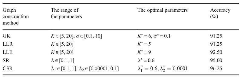 為了驗(yàn)證CSR模型是否可以構(gòu)建更具判別性的連接圖,其他的圖構(gòu)造方法包括高斯核(GK)函數(shù),局部線性嵌入(LLE),局部線性重建(LLR),以及稀疏表示模型(SR)在使用無(wú)特征選擇和相同標(biāo)簽傳播(LP)算法的情況下與CSR模型進(jìn)行了比較。具體模型參數(shù)設(shè)置如表1所示。