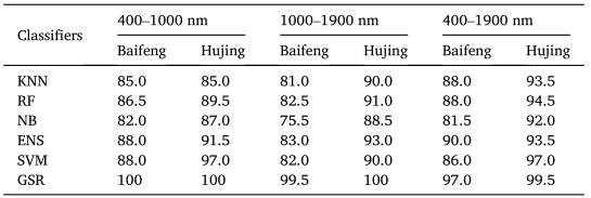 使用留一交叉驗(yàn)證計(jì)算六種算法的平均分類精度(表2)。在所有分類器中,GSR分類器在所有情況下的總體分類精度*高。在所有波長(zhǎng)范圍內(nèi),“湖景”的分類精度都高于“白鳳”。“湖景”在1000 - 1900 nm波段的分類精度大多優(yōu)于400 - 1000 nm波段的分類精度,這可能是由于1000 - 1900 nm波段的光譜反射信息中含有與可溶性糖含量相關(guān)的判別因素。