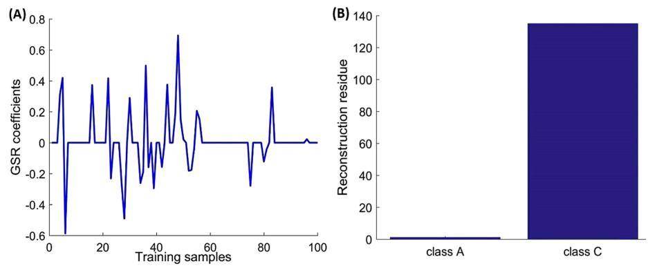 圖4 A類測(cè)試樣本的組稀疏表示分類器系數(shù)(A)以及相對(duì)于A類和C類的重構(gòu)殘差(B)