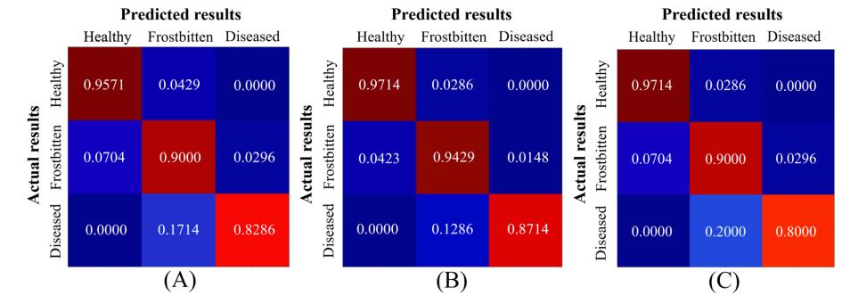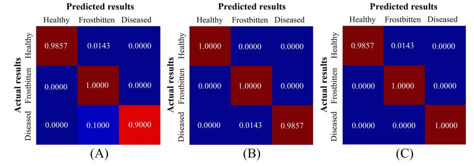 圖4 PLS-DA的混淆矩陣:(A)MCUVE-PLS-DA模型,(B)RF-PLS-DA模型,(C)SPA-PLS-DA模型