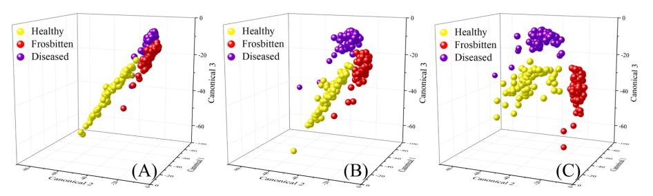 圖5 LDA模型三維散點(diǎn)圖:(A)MCUVE-LDA模型,(B)RF-LDA模型,(C)SPA-LDA模型
