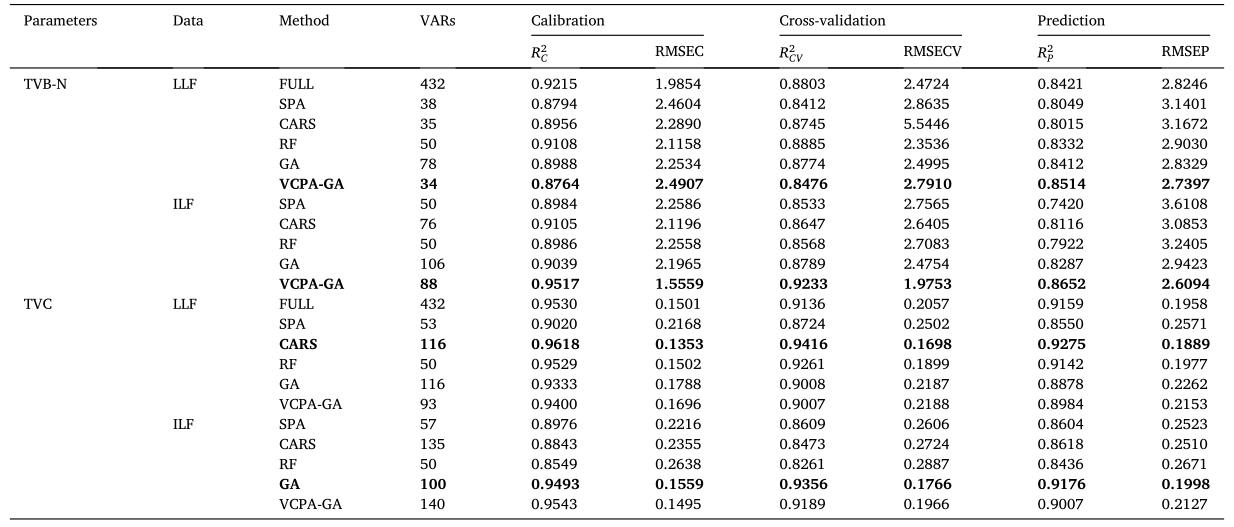 3)光譜數(shù)據(jù)預(yù)處理及結(jié)果分析。由于光譜數(shù)據(jù)包含儀器和檢測(cè)條件引起的噪聲和雜散光等干擾信息,該研究利用了高斯濾波平滑(GFS)、Savitzky–Golay平滑(SGS)方法、最小二乘擬合導(dǎo)數(shù)系數(shù)、一階導(dǎo)數(shù)(FD)、二階導(dǎo)數(shù)(SD)和標(biāo)準(zhǔn)正態(tài)變換等七種不同預(yù)處理方法分別對(duì)Vis-NIR、NIR和LLF的全光譜數(shù)據(jù)進(jìn)行了預(yù)處理并建立了PLSR模型。根據(jù)校正集、交叉驗(yàn)證集和測(cè)試集的決定系數(shù)(RC2、RCV2和RP2)、以及均方根誤差(RMSEC、RMSECV和RMSEP)分別確定了Vis-NIR、NIR和LLF光譜數(shù)據(jù)對(duì)TVB-N含量的*佳預(yù)處理方法為SNV、SD和SD,TVC含量的*佳預(yù)處理方法為Nor、GFS和NOR;并使用*佳預(yù)處理方法進(jìn)行后續(xù)的研究。
