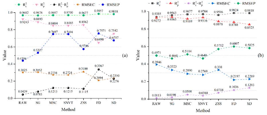 基于高光譜技術(shù)建立的模型結(jié)果受多種因素的影響。特征數(shù)據(jù)預(yù)處理方法是影響分析結(jié)果的主要因素。常見的光譜數(shù)據(jù)預(yù)處理方法包括正交信號(hào)校正(OSC)、一階導(dǎo)數(shù)(FD)、二階導(dǎo)數(shù)(SD)、多元散射校正(MSC)、標(biāo)準(zhǔn)正態(tài)變量變換(SNVT)、Savitzky-Gola濾波(SG)。結(jié)果表明,這些方法可以減少外界因素的影響,在一定程度上提高檢測(cè)的準(zhǔn)確性。