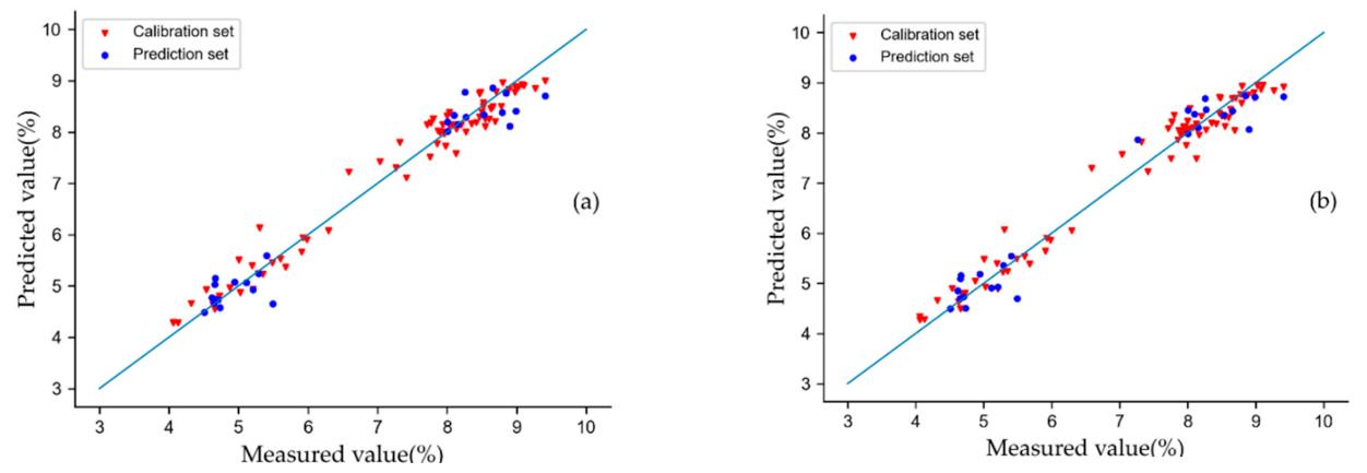 圖2 不同輸入下GBR模型的預(yù)測(cè)結(jié)果?;贙S劃分?jǐn)?shù)據(jù)集的建模結(jié)果(a)、基于SPXY劃分?jǐn)?shù)據(jù)集的建模結(jié)果(b)。