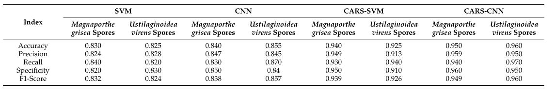 表1和表2分別展示了不同模型的分類結(jié)果以及分類指標(biāo)結(jié)果。以CARS篩選后的波段為變量的分類模型優(yōu)于以全波段為變量的分類模型。通過比較CARS-SVM和CARS-CNN分類模型,發(fā)現(xiàn)兩種模型對稻瘟菌孢子的分類結(jié)果相似。而CARS-CNN模型對于稻綠核菌孢子的分類結(jié)果中,其二級指標(biāo)中的準確率、精確率、召回率和特異性分別為0.960、0.950、0.970和0.950,三級指標(biāo)的F1得分為0.960,遠高于CARS-SVM分類模型。F1得分越接近1,說明分類效果越好。因此,CARS-CNN分類模型在稻綠核菌孢子分類中更有優(yōu)勢。