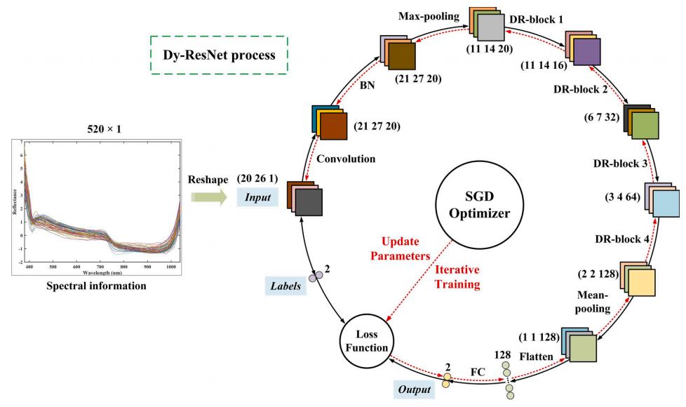 (2)提出了一種基于動態(tài)殘差網(wǎng)絡(luò)(Dy-ResNet)的高光譜數(shù)據(jù)挖掘模型。在模型優(yōu)化過程中引入殘差模塊,避免梯度消失;引入動態(tài)卷積層,提高模型的自適應(yīng)性和表示能力。