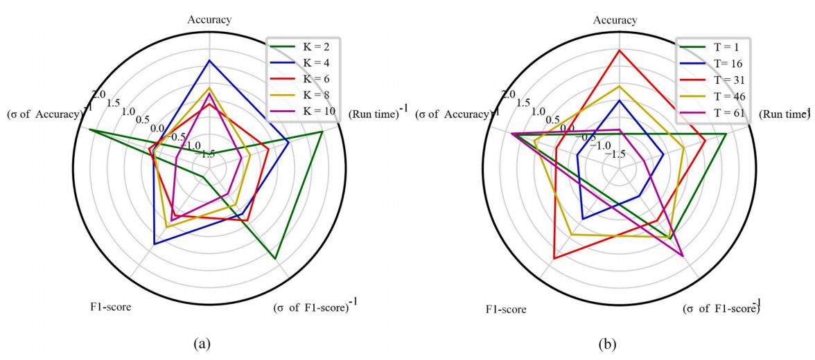 在動態(tài)卷積層中,參數(shù)K和T顯著影響穩(wěn)定性和精度。如果K過大,雖然模型具有更強的表達(dá)能力,但優(yōu)化所有卷積核和注意力更加困難,網(wǎng)絡(luò)更容易出現(xiàn)過擬合。在softmax層中,T控制了注意力權(quán)值的稀疏性,適當(dāng)?shù)腡可以使模型在早期訓(xùn)練中更有效。因此,有必要確定K和T的最優(yōu)值。如圖5所示,當(dāng)K較小時,模型的訓(xùn)練時間和分類穩(wěn)定性都較好。然而,K的數(shù)量限制了動態(tài)卷積核的自適應(yīng)能力,降低了模型的分類精度和F1-score。當(dāng)K設(shè)置為4時,既保證了模型的分類性能,又充分考慮了訓(xùn)練時間。T越大,模型的穩(wěn)定性越高。但是,當(dāng)T過于大時,模型的分類性能會下降,因此將T設(shè)為31。