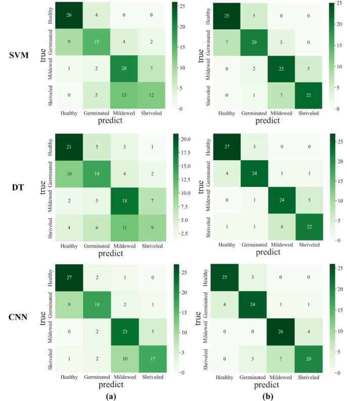 圖7 三種分類器在不平衡數(shù)據(jù)集(a)和平衡數(shù)據(jù)集(b)上分類結果的混淆矩陣
