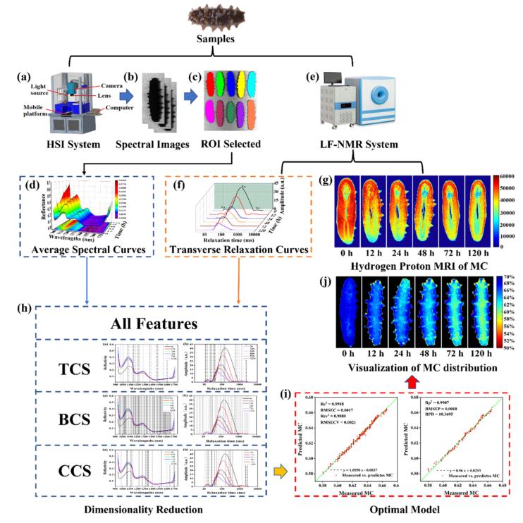 大量研究使用高光譜成像(Hyperspectral imaging, HSI)和低場(chǎng)核磁共振(Low field nuclear magnetic resonance, LF-NMR)研究水的遷移和變化并預(yù)測(cè)MC。HSI是一種用于探測(cè)淺水表面物理和化學(xué)性質(zhì)的快速、無損監(jiān)測(cè)技術(shù)。LF-NMR是另一種流行的無創(chuàng)檢測(cè)技術(shù),用于監(jiān)測(cè)食品中水分狀態(tài)的變化和水分遷移。低頻核磁共振之所以有效,是因?yàn)楫?dāng)電磁脈沖(Electromagnetic pulse, EMP)在垂直方向輻射時(shí),氫質(zhì)子由于能量從低能級(jí)到高能級(jí)的轉(zhuǎn)變而處于不穩(wěn)定狀態(tài),而當(dāng)EMP消失時(shí),這一過程是可逆的。對(duì)于海參淺層表面復(fù)雜的棘皮結(jié)構(gòu)和內(nèi)部復(fù)雜的腔體、體壁等結(jié)構(gòu),HSI和LF-NMR聯(lián)合檢測(cè)可以更準(zhǔn)確地預(yù)測(cè)MC。
