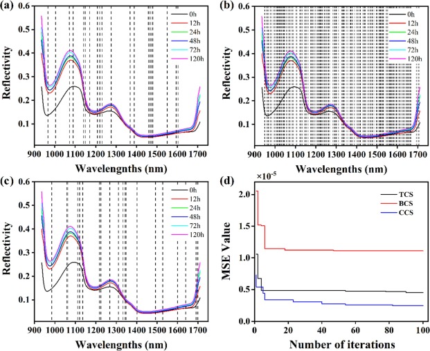 圖9 利用LF-NMR-TCS-DL(a), LF-NMR-BCS-DL(b), LF-NMR-CCS-DL(c)模型選擇的波段以及其MSE衰減(d)。
