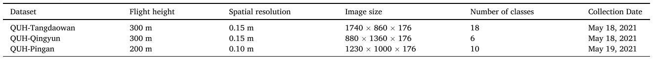 中國石油大學(xué)孫根云教授團(tuán)隊(duì)選取了位于中國山東省青島市西海岸新區(qū)的三個(gè)研究區(qū)(圖1)。在此研究中構(gòu)建了具有高分類挑戰(zhàn)的QUH數(shù)據(jù)集。QUH數(shù)據(jù)集包含三個(gè)子數(shù)據(jù)集,即QUH-唐島灣、QUH-青云和QUH-平安,均由安裝在無人機(jī)平臺(tái)上的高光譜傳感器Gaiasky mini2-VN成像光譜儀(江蘇雙利合譜科技有限公司)獲取,規(guī)格如圖2所示。三個(gè)數(shù)據(jù)集的詳細(xì)飛行參數(shù)信息如表1所示。QUH-唐島灣、QUH-青云、QUH-平安數(shù)據(jù)集詳細(xì)的土地覆蓋分布及相應(yīng)的光譜曲線分別如圖3和圖4、圖5和圖6、圖8和圖9所示。然而,QUH-青云數(shù)據(jù)集的某些區(qū)域被建筑物陰影遮擋,包括樹木、汽車和瀝青道路等類別(圖7)。